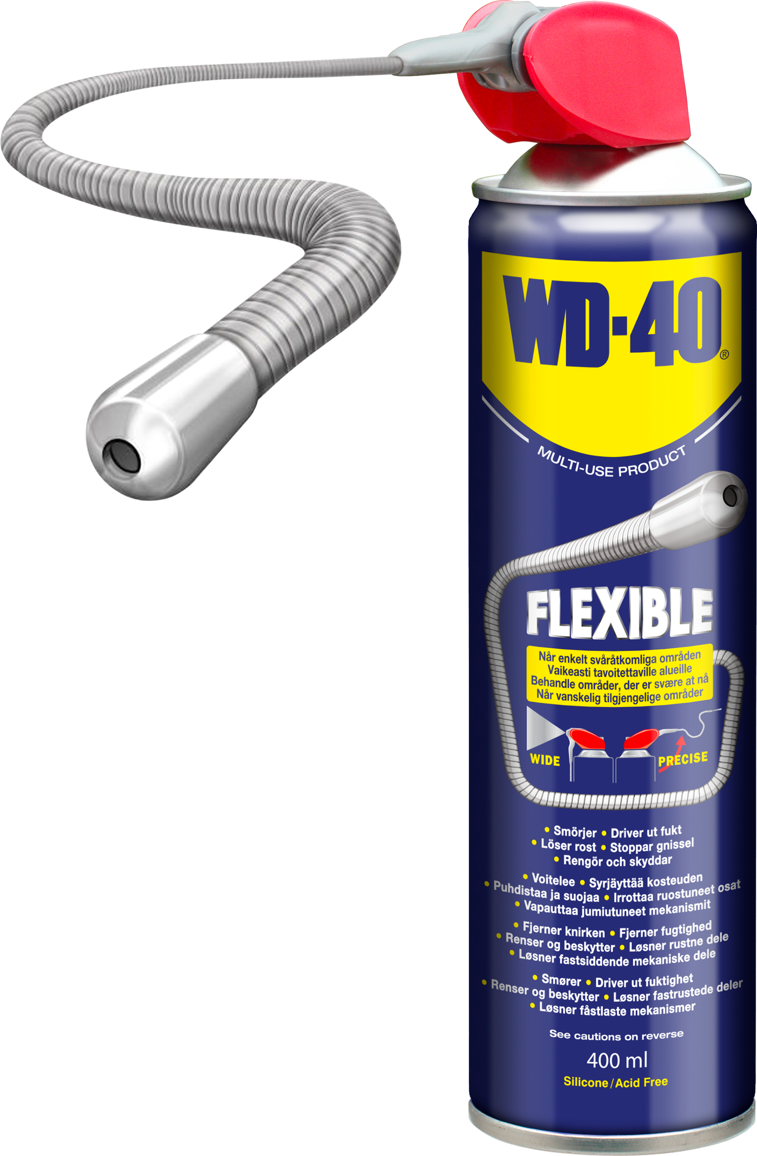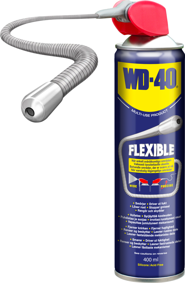 WD-40 Flexible er en opgraderet version af den populære WD-40 SmartStraw. Med applikatorrøret foldet op sprøjtes produktet præcist, og ved hjælp af det fleksible applikatorrør kan svært tilgængelige steder lettere nås. Med applikatorrøret foldet ned sprøjtes produktet bredt og rigeligt. 360°-ventilen betyder, at dåsen kan bruges i alle mulige vinkler og retninger - selv på hovedet.