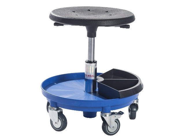 Global kørestol med hylde og værktøjskasser. Stolen giver behagelig aflastning af ryg, knæ og ankler. Bruges i stedet for at knæle eller sidde på hug under arbejdet. Højdejusterbar med let tilgængelige betjeningselementer og slidstærkt sæde.