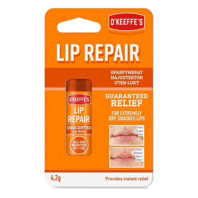 O’Keeffe’s Lip Repair Läppbalsam lindrar och återfuktar torra och spruckna läppar hela dagen. Vid daglig användning är det kliniskt bevisat att O’Keeffe’s® Lip Repair-läppbalsam: